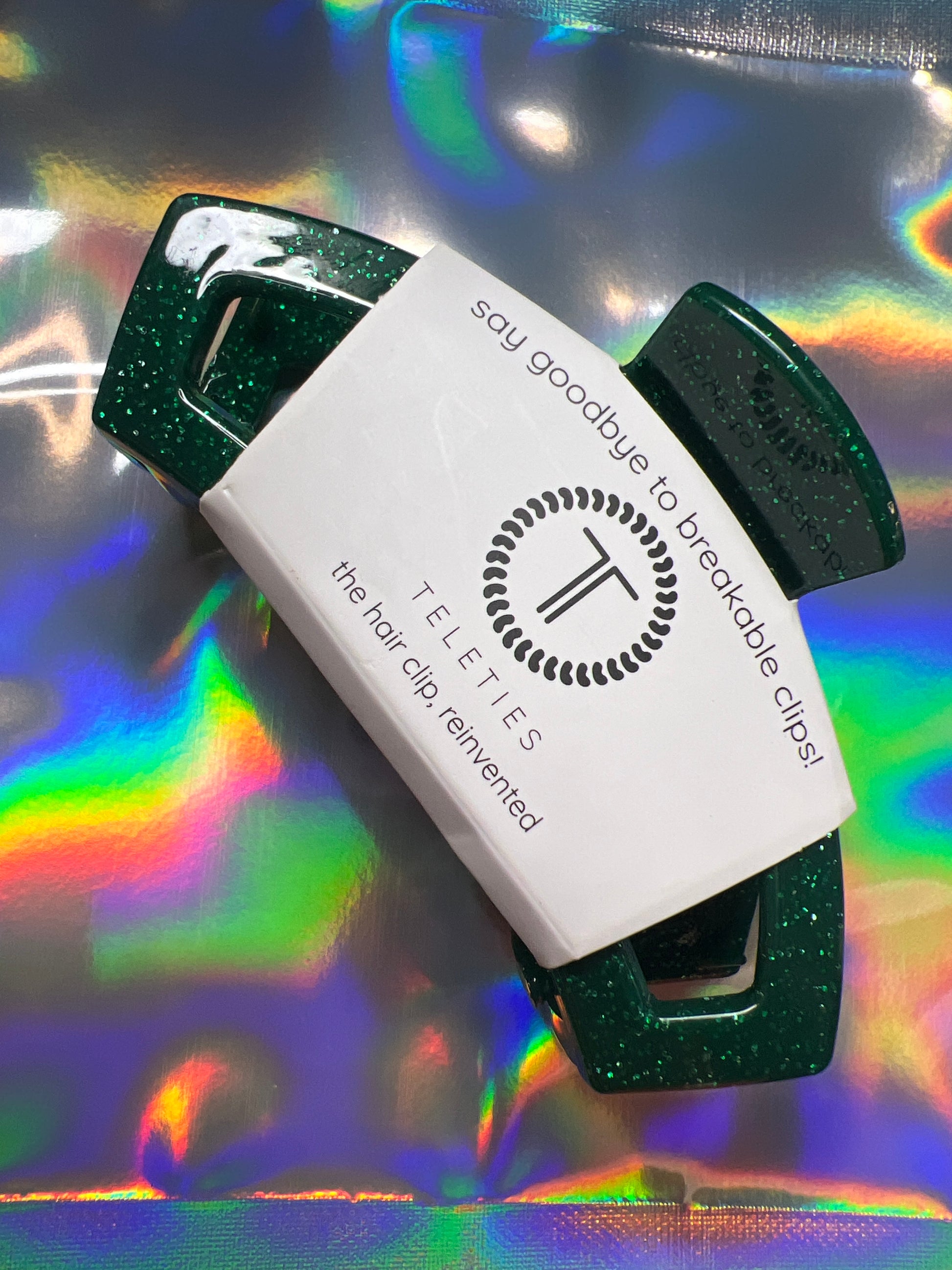 Tie up in style with the Small Teletie in Green Open! This trendy hair accessory features a strong Teletie Clip, ensuring no more breakable clips. The beautiful green glitter color adds a touch of glamour, making it the perfect accessory for the holiday season. Say goodbye to bad hair days and hello to effortless style!
