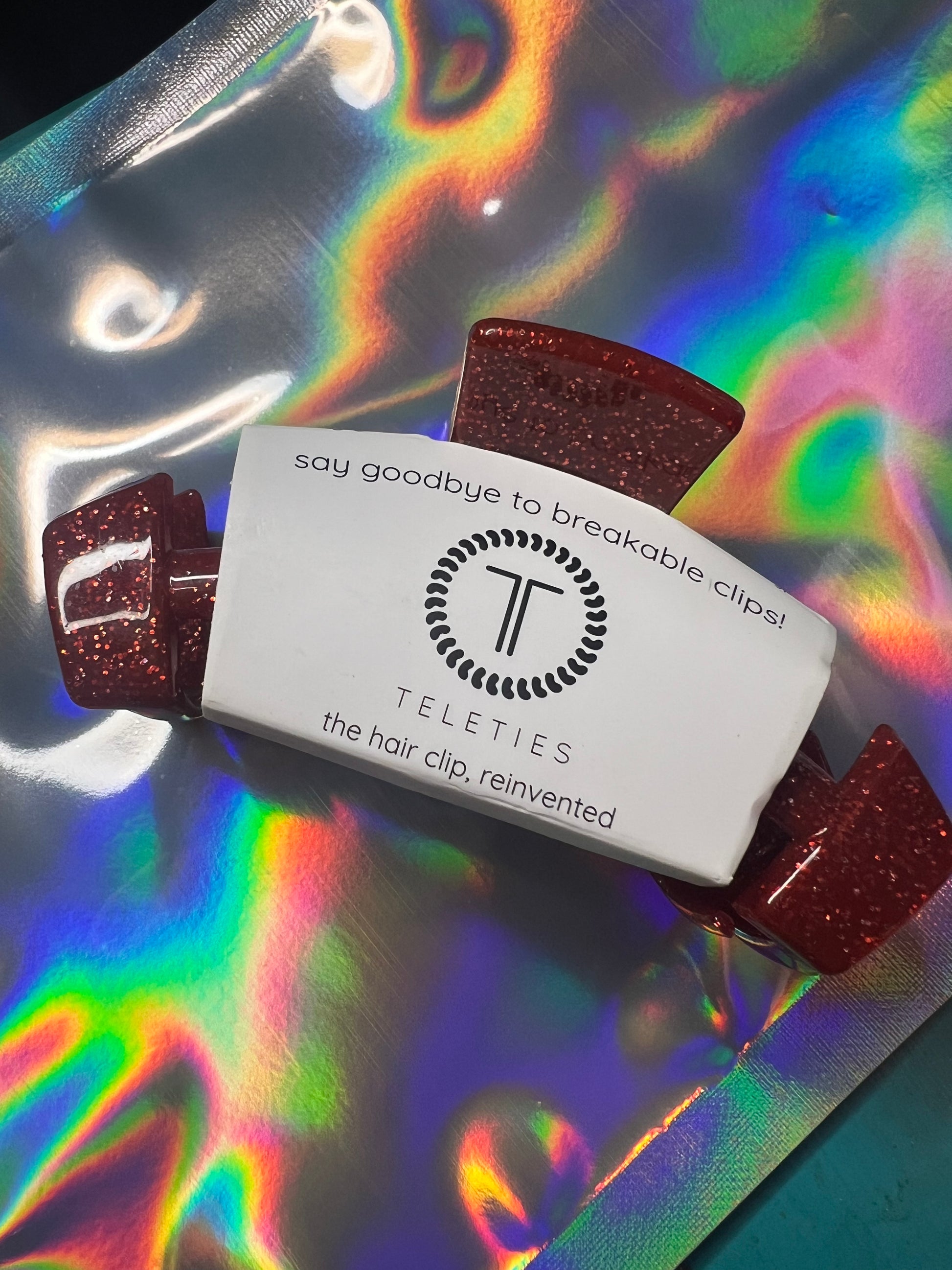 Tie up in style with the Small Teletie in Red Bone! This trendy hair accessory features a strong Teletie Clip, ensuring no more breakable clips. The beautiful red glitter color adds a touch of glamour, making it the perfect accessory for the holiday season. Say goodbye to bad hair days and hello to effortless style!